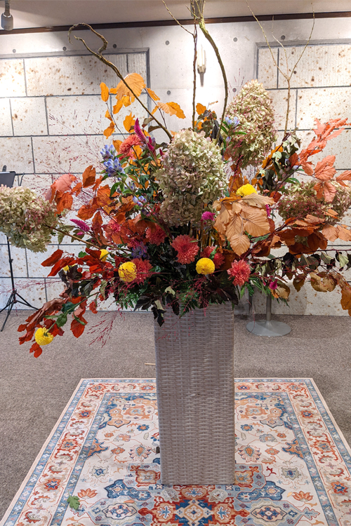 花は季節感を意識し、紅葉した葉、秋の花々を使い音楽に合わせて生けました。